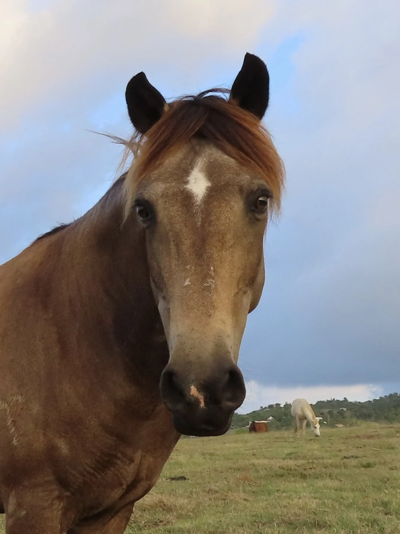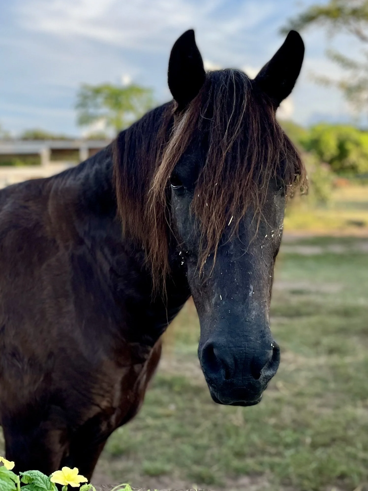 He's a big boy with a sweet demeanor, kind eye and upbeat, forward way of going. He definitely spent some time showing the smaller horses how fast he could go on the streets of PR. Given his confirmation and natural pace, we're pretty sure he has some Standardbred in him.